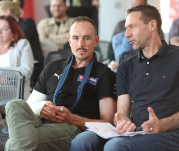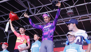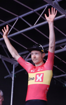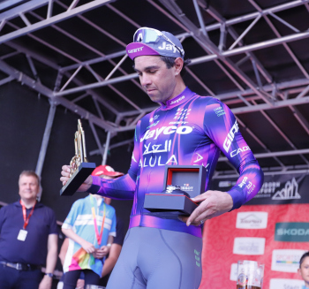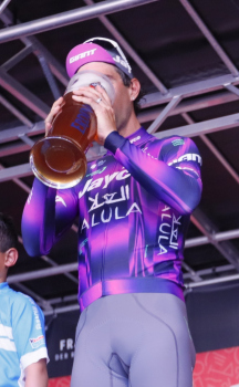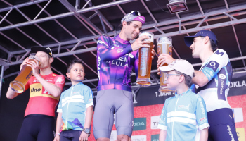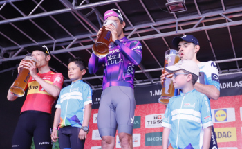Zweitplatzierter Magnus Cort (Uno-X Mobility), Sieger Michael Matthews (Team Jayco AlUla) und Drittplatzierter Jon Barrenetxea Golzarri (Movistar Team) auf dem Siegerpodest