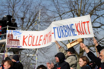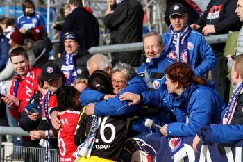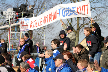 Aktion, Schlussjubel bei den Fans von Turbine Potsdam, die das Transparent hochhalten Kölle am Rhein - Turbine Kütt