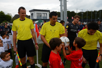 Schiedsrichter Abdelkader Boulghalegh mit seinen Linienrichtern Alessandro Scotece und Mirko Radl