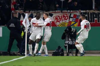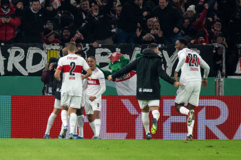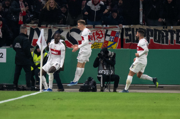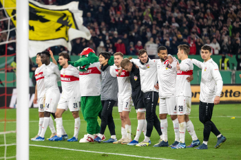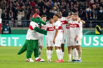 Jubel und Freude bei Wooyeong Jeong, Silas Katompa Mvumpa,, Leonidas Stergiou, Maskottchen Fritzle, Genki Haraguchi, Maximilian Mittelstädt, Chris Führich, Pascal Stenzel, Josha Vagnoman und Anthony Rouault (VfB Stuttgart).