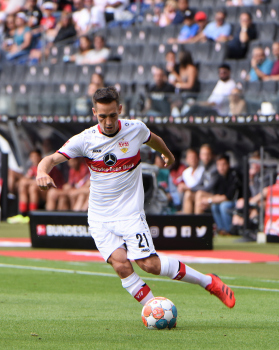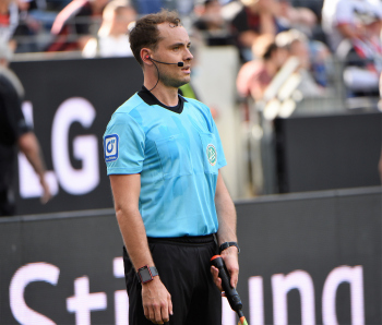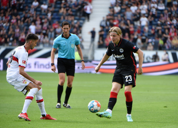 Atakan Karazor (VfB Stuttgart) gegen Jens Petter Hauge (23, Eintracht Frankfurt), Schiedsrichter Dr. Mattias Jöllenbeck