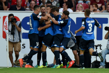 Hoffenheim jubelt ueber den Ausgleich zum 4:4, Torschuetze Adam SZALAI (TSG 1899 Hoffenheim)), Niklas SUELE (TSG 1899 Hoffenheim), Pavel KADERABEK (TSG 1899 Hoffenheim), Sandro WAGNER (TSG 1899 Hoffenheim).