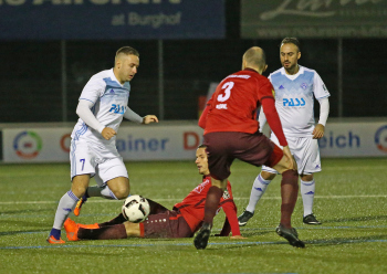 02.02.2018, xxx Fussball, Testspiel 2018, SC Hessen Dreieich Hessenliga - SV Viktoria Aschaffenburg Bayernliga Nord; v.l. Tim Fliess (SC Hessen Dreieich), Ljubisa Gavric (SC Hessen Dreieich), Johannes Gerhart (SV Viktoria Aschaffenburg), Carlos McCrary (SC Hessen Dreieich), , Ricardo Doebert Torwart (SV Viktoria Aschaffenburg),