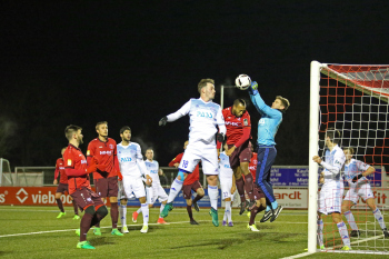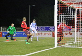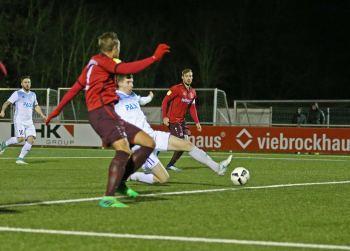 02.02.2018, xxx Fussball, Testspiel 2018, SC Hessen Dreieich Hessenliga - SV Viktoria Aschaffenburg Bayernliga Nord; v.l. Pierre Kleinheider Torwart (SC Hessen Dreieich), Ljubisa Gavric (SC Hessen Dreieich), Nils Herdt (SV Viktoria Aschaffenburg), Joern Merten Kohl (SC Hessen Dreieich), kratzt den Ball von der Linie