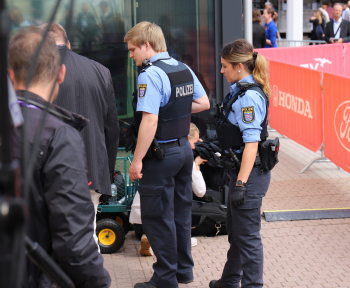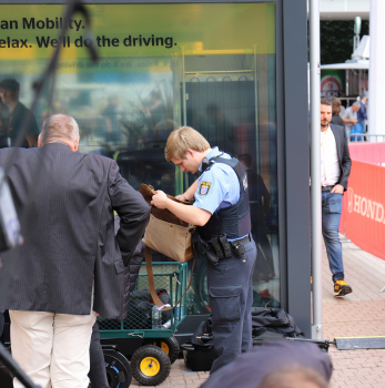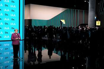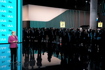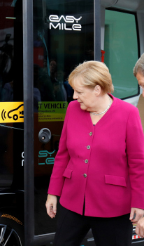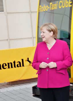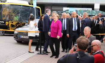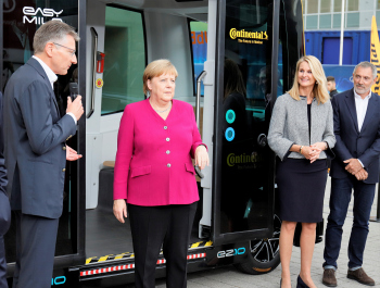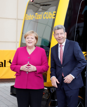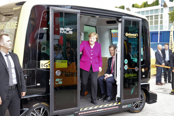 Bundeskanzlerin Angela Merkel im Freigelände auf dem Stand von Contnental mit dem CUbE(Continental Urban mobility Experience) autonomes Shuttle