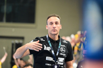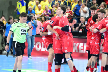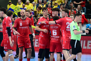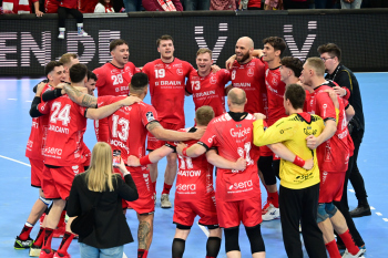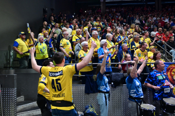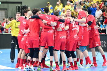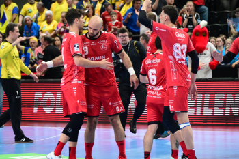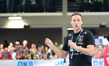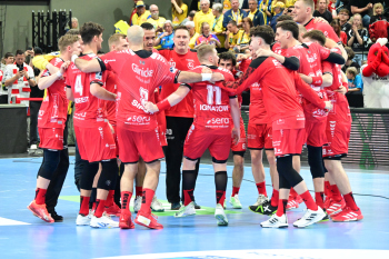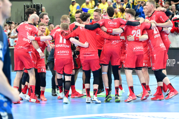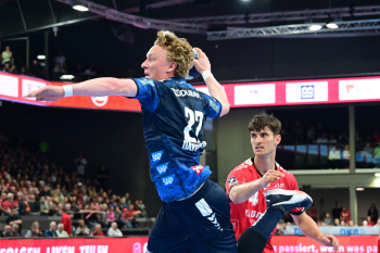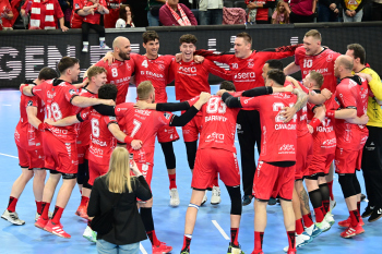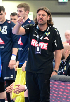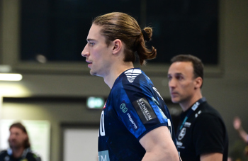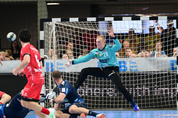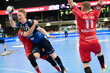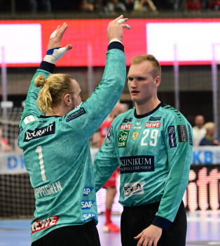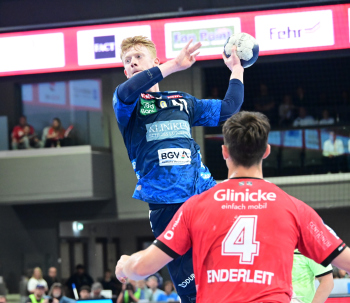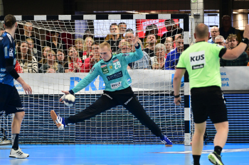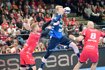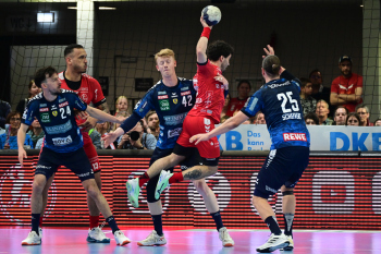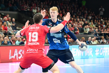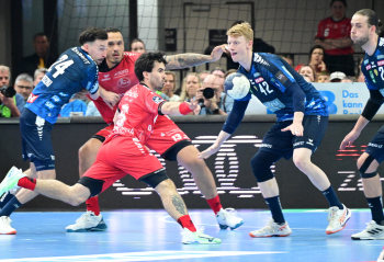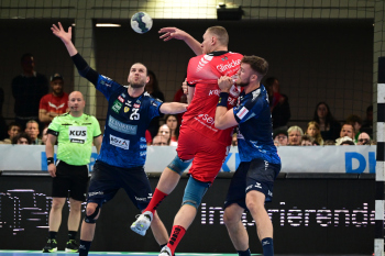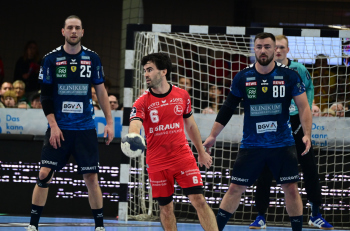 Patrick Groetzki, Jon Lindencrone Andersen, Olle Forsell-Schefvert ( Rhein-Neckar Löwen) gegen Erik Balenciaga (6, MT Melsungen)