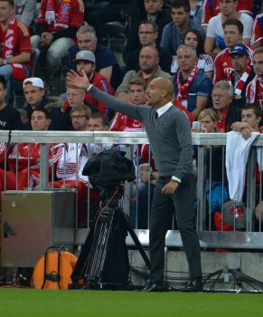 Cheftrainer Pep Guardiola (FC Bayern Muenchen) lautstark an der Seitenlinie , gestikulierend waehrend dem Spiel der 1. Fussball Bundesliga FC Bayern Muenchen vs. VfL Wolfsburg am 22.08.2014 in der Allianz Arena // during the Match FC Bayern Muenchen vs. VfL Wolfsburg on 2014/08/22 at Allianz Arena