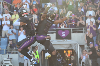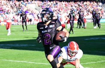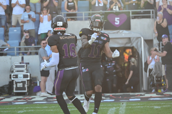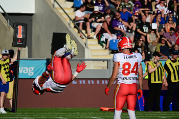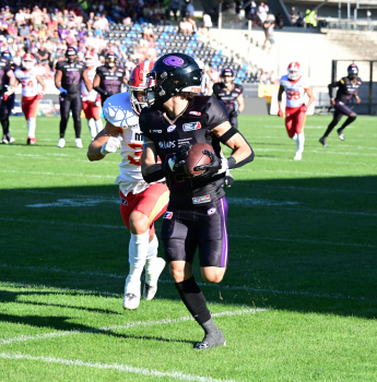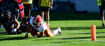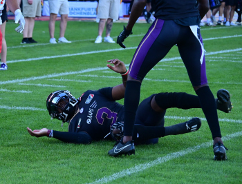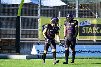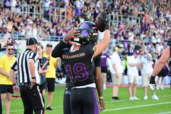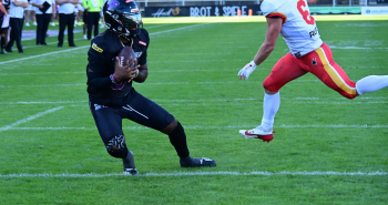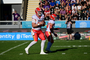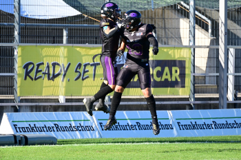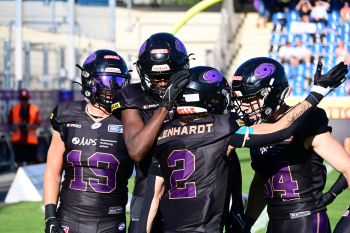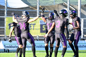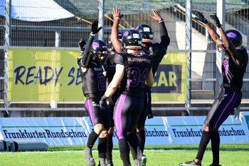 Lenhardt, Paul (2, Frankfurt Galaxy) jubelt mit Platzgummer, Sandro (34, Frankfurt Galaxy), Strahmann, Nico (19, Frankfurt Galaxy) und McKay, Matthew (3, Frankfurt Galaxy)