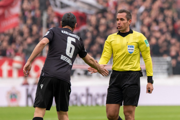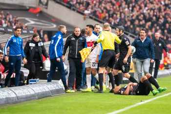 Rudelbildung vor der KSC-Bank, Marc Lorenz (Karlsruher SC), Nicolas Gonzalez (VfB Stuttgart), Schiedsrichter-Assistent Christian Gittelmann, Damian Rossbach (Karlsruher SC) und Trainer Alois Schwartz (Karlsruher SC), David Pisot (Karlsruher SC) liegt verletzt am Boden.