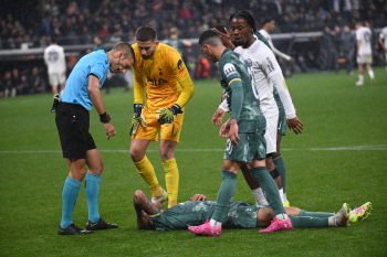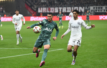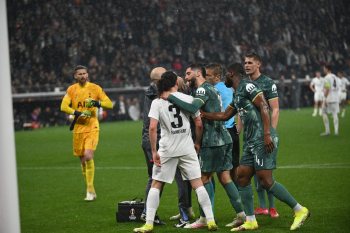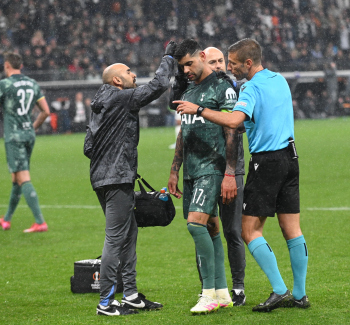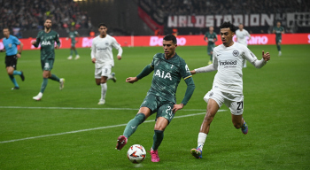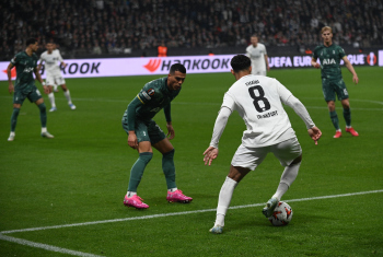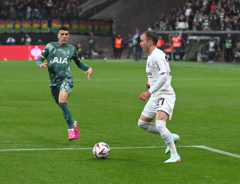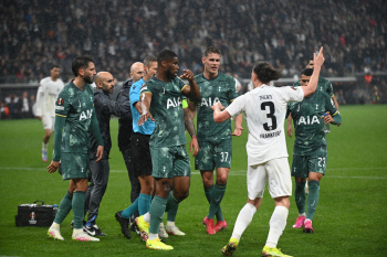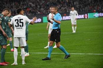 Tuta (35, Eintracht Frankfurt) diskutiert mit Schiedsrichter Davide Massa, Torwart Guglielmo Vicario (Tottenham), Pedro Porro (Totenham), Kevin Danso (Tottenham), Arthur Theate (3, Eintracht Frankfurt)