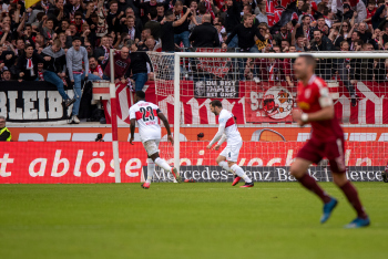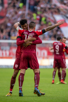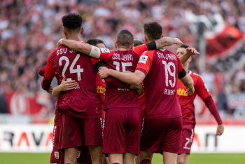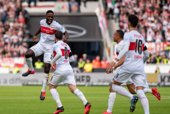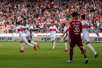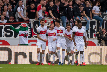 Jubel und Freude bei Maskottchen Fritzle, Phillips Nathaniel, Torschütze Gonzalo Castro, Atakan Karazor, Pascal Stenzel, Hamadi Al Ghaddioui und Orel Mangala (VfB Stuttgart).