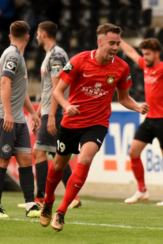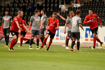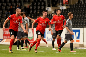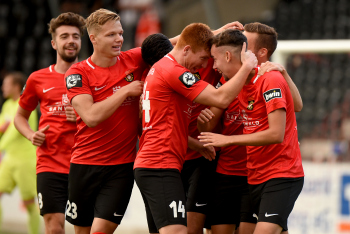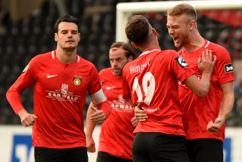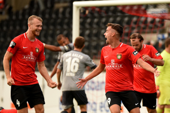 Jubel und Freude bei Dominik Pelivan (SG Sonnenhof-Grossaspach), Philipp Hercher (SG Sonnenhof-Grossaspach), Patrick Choroba (SG Sonnenhof-Grossaspach) und Torschütze Marco Hingerl (SG Sonnenhof-Grossaspach).