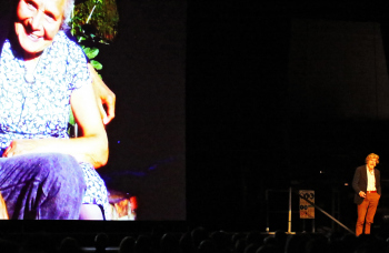 01.12.2019, xxx, Reinhold Messner, Vortrag fuer sein neues Buch ?berleben,, - Live 2019, Offenbach am Main, Reinhold Messner ganz klein mit viel Leinwand im Hintergrund