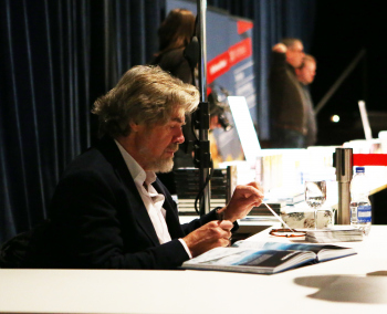 01.12.2019, xxx, Reinhold Messner, Vortrag fuer sein neues Buch ?berleben,, - Live 2019, Offenbach am Main,; beim signieren, von der Seite, schaut ins Buch