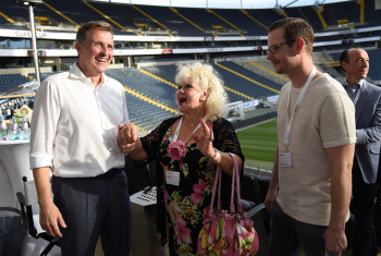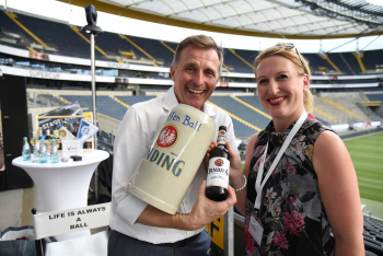 08.08.2018 Frankfurt, Commerzbankarena Ballcom feiert 50 und 15 Geburtstagskind Steffen Ball freut sich über Bierkrug und Ballcom-Bier von Marketingchefin Claudia Geisler