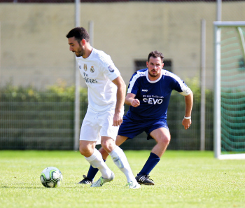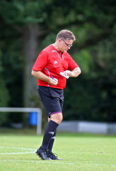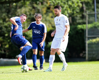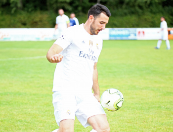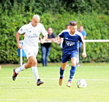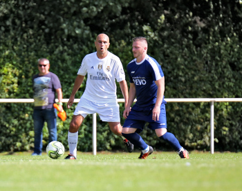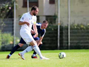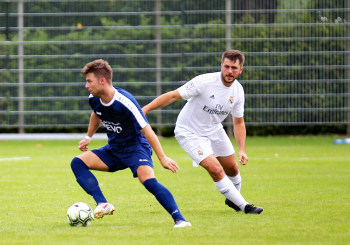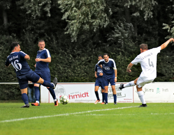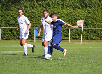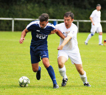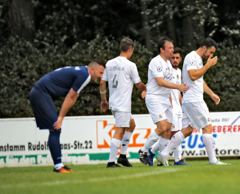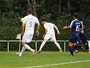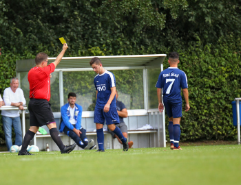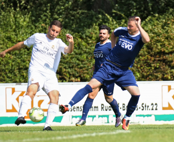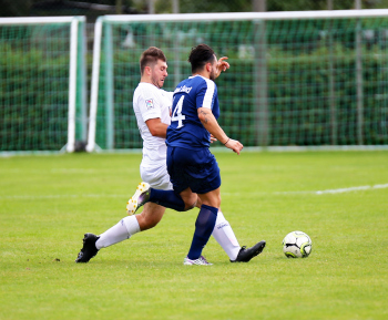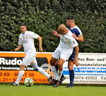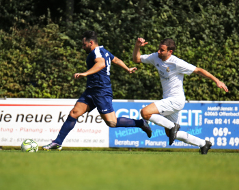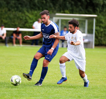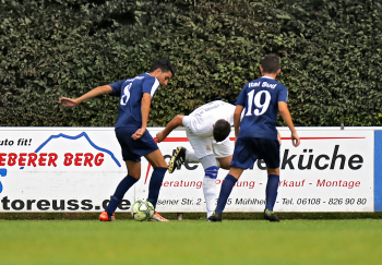 18.08.2019 Kreisliga A Offenbach Gruppe 2; Offenbach am Main; Stadion Waldhofstrasse, Espanol Offenbach gegen Italsud Offenbach; in weiss Abdelhamid El Krafli (Espanol Offenbach); in blau Dimitrios Tzimas (Italsud Offenbach); Daniele Manoti (Italsud Offenbach);