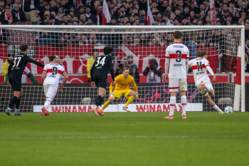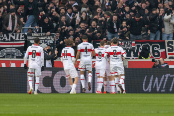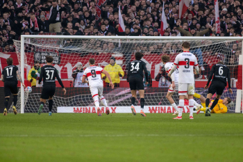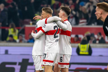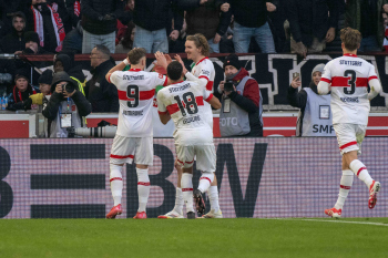 Stuttgarter Torjubel, v.l. Enzo Millot, Nick Woltemade, Josha Vagnoman, Ermedin Demirovic, verdeckt Torschütze Anthony Rouault und Ameen Al-Dakhil (VfB Stuttgart).