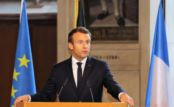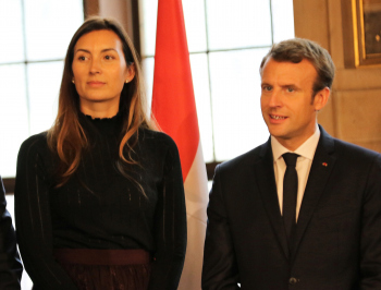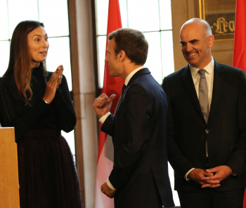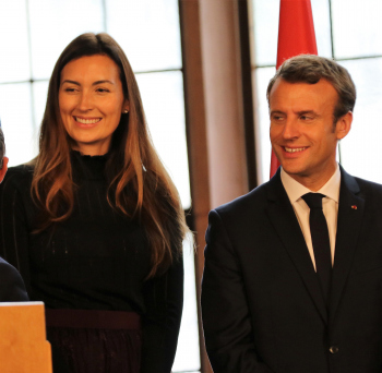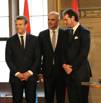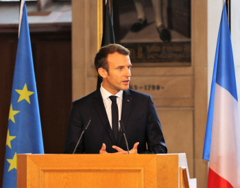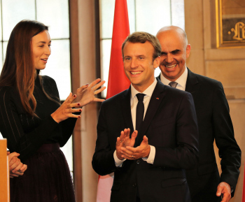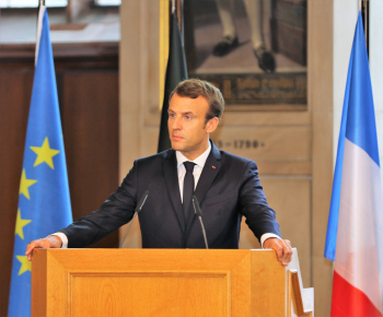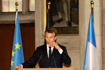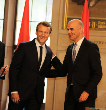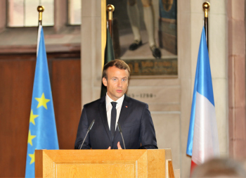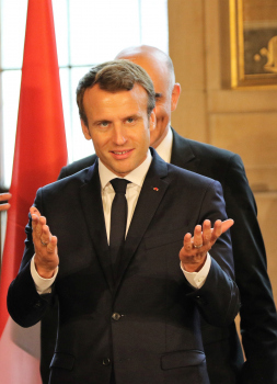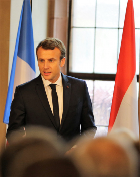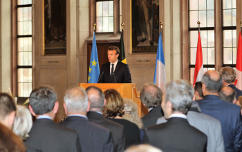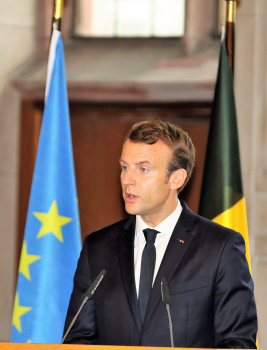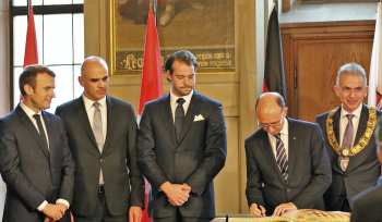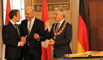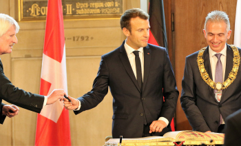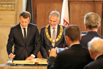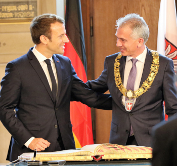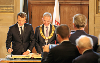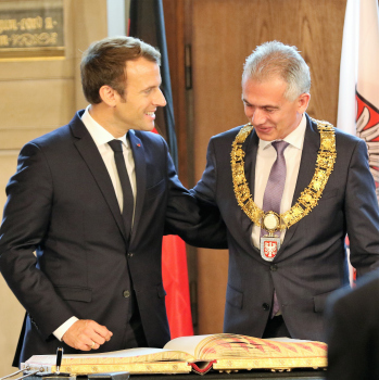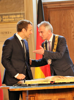 Frankreichs Staatspräsident Emmanuel Macron trägt sich in goldene Buch ein daneben Frankfurts Oberbürgermeister Peter Feldmann mit seiner Amtskette