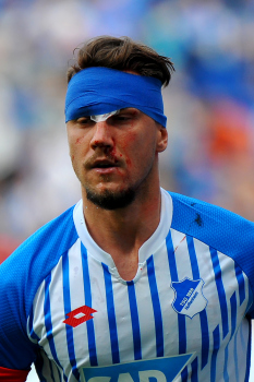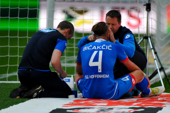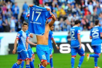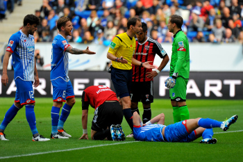 Tobias STROBL (TSG 1899 Hoffenheim), Eugen POLANSKI (TSG 1899 Hoffenheim), Schiedsrichter, Referee Bastian DANKERT, Torwart Oliver BAUMANN (TSG 1899 Hoffenheim), Ermin BICAKCIC (TSG 1899 Hoffenheim) verletzt am Boden.