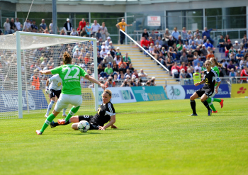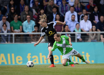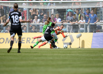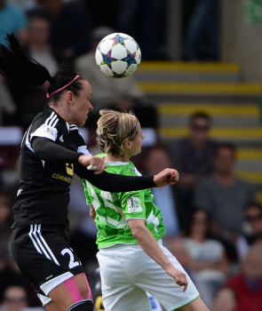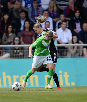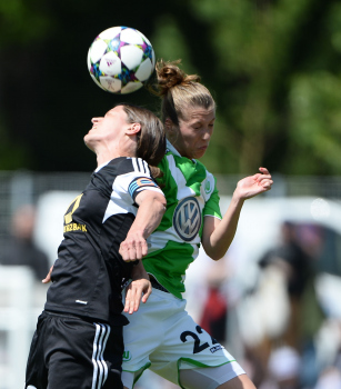 FRANKFURT - DEUTSCHLAND - 10.05.2015 - FUSSBALL - Allianz Frauen Bundesliga - 1. FFC Frankfurt vs VfL Wolfsburg - Saison 2014-2015 - 22. Spieltag. Bild zeigt: Kopfballduell zwischen Kerstin Garefrekes (1. FFC Frankfurt) und Verena FAISST (VfL Wolfsburg)