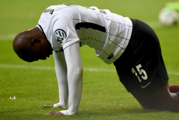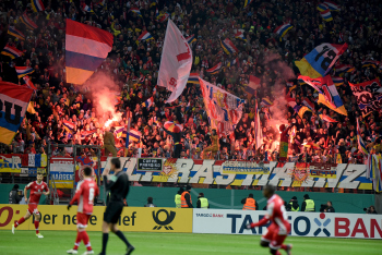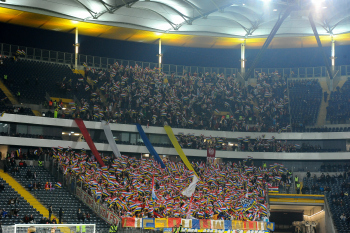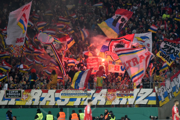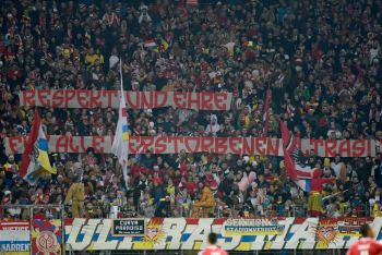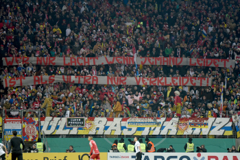 Transparent, Spruchband von den Mainzer-Fans im Fanblock mit dem Text: Wernur lacht, wenn jemand Leidet, ist als Ultra nur verkleidet!.