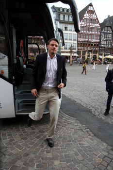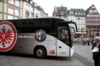 Die Mannschaft der Eintracht mit Sebastian Rode, Srdjan Lakic und rechts Eintracht-Vorstand Heribert Bruchhagen vor den Deutschen Kaisern