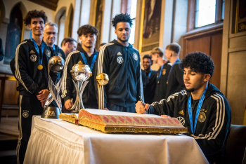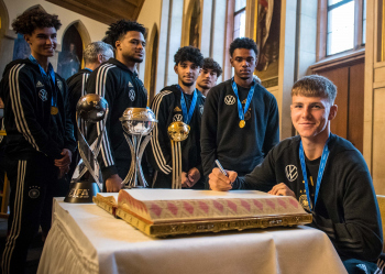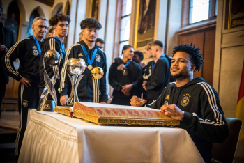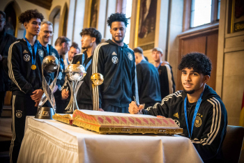 04.12.2023 xesx Frankfurtam Main, Römer Eintrag der U17-Weltmeister_Nationalmanschaft ins goldene Buch der Stadt Frankfurt Bild zeigt Noah Darvich U17 Weltmeister ********* Foto: Peter Hartenfelser