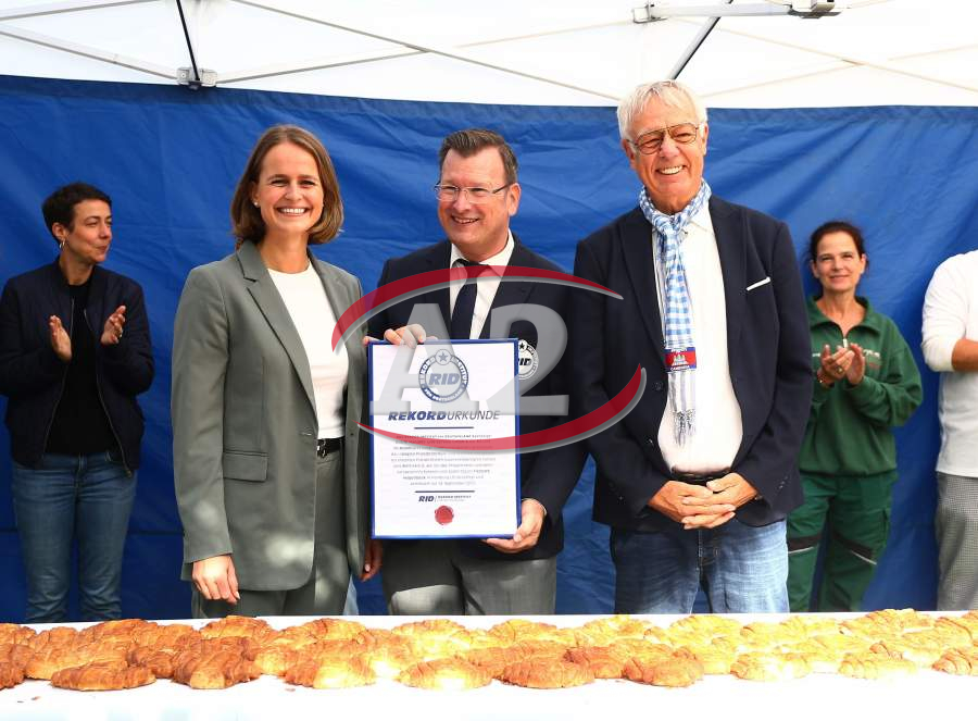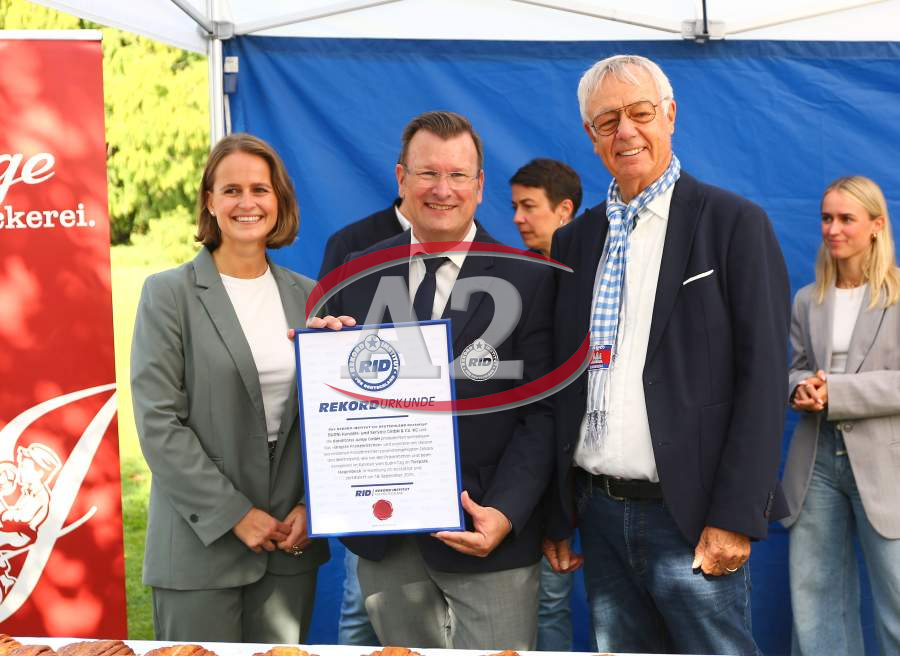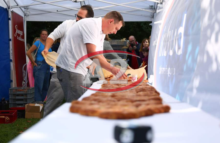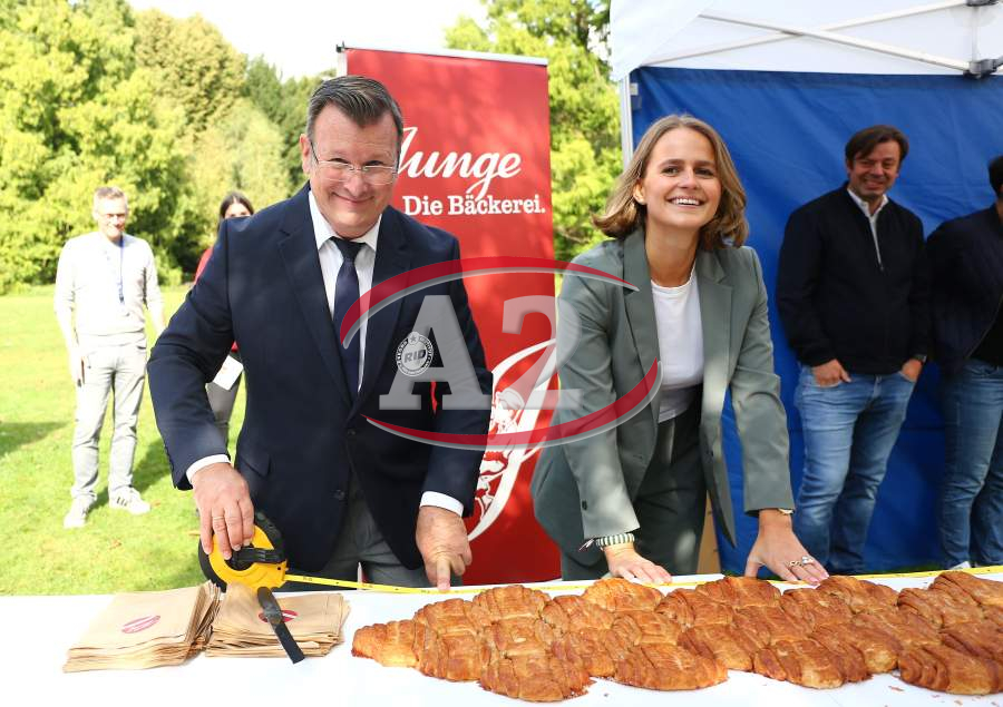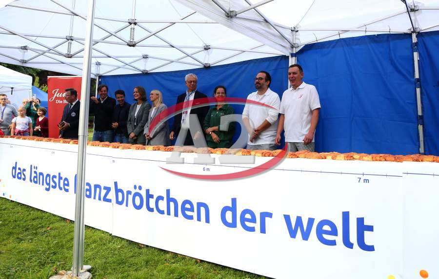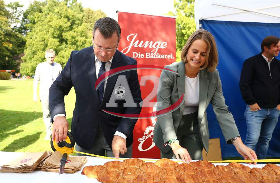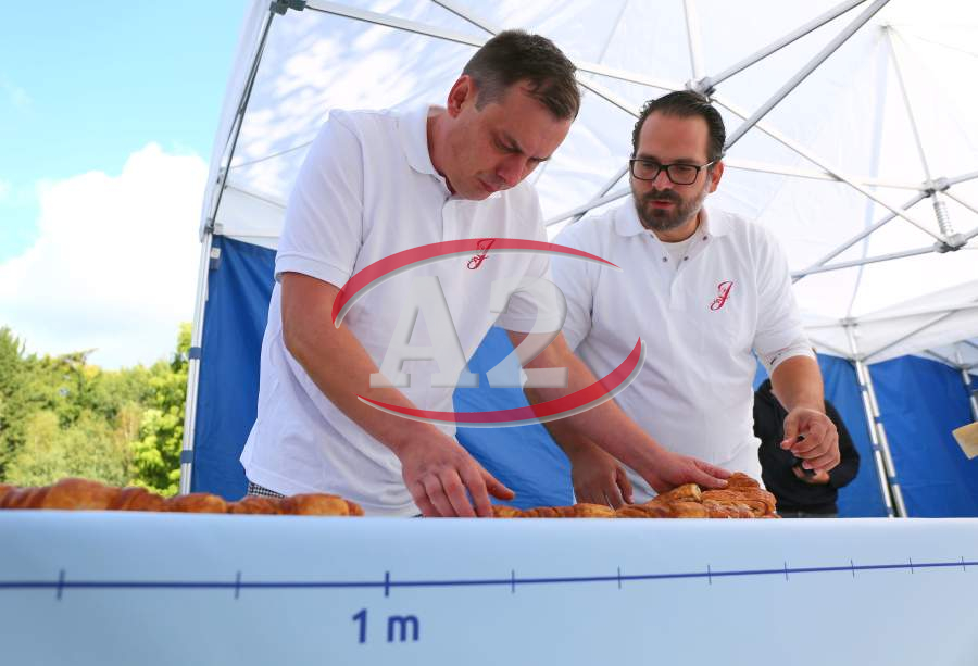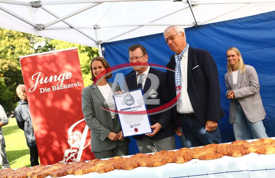 14.09.2025, xcex, GER, Hamburg, Tierpark Hagenbeck, Weltrekordversuch, Weltrekord, das laengste Franzbroetchen aus einzeln zusammengefuegtem Gebaeck, Praesentation und Verspeisen im Tierpark Hagenbeck am Budni-tag, Budnikowsky Drogerie, Konditorei Junge, RID, Rekord Institut fuer Deutschland,