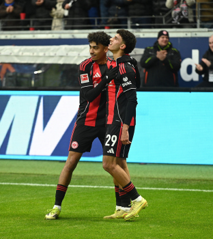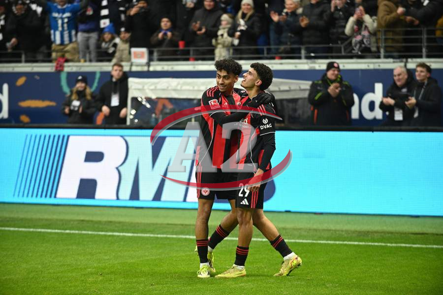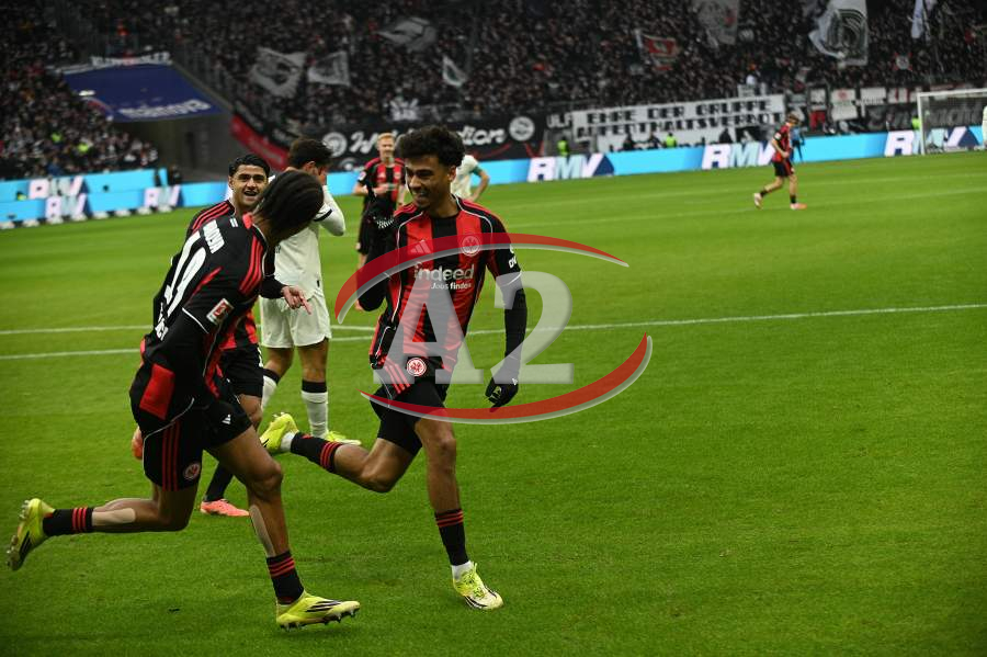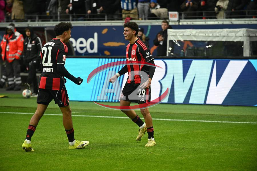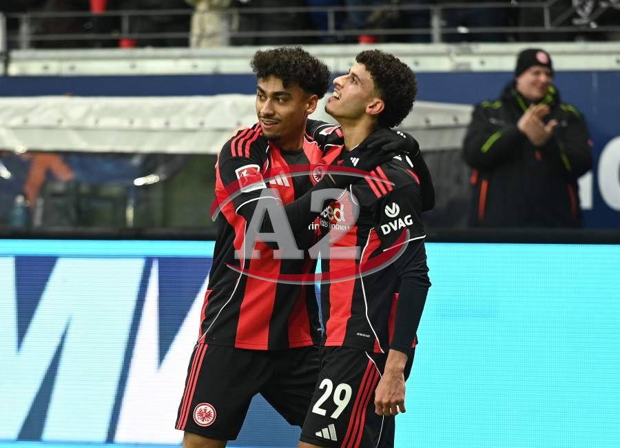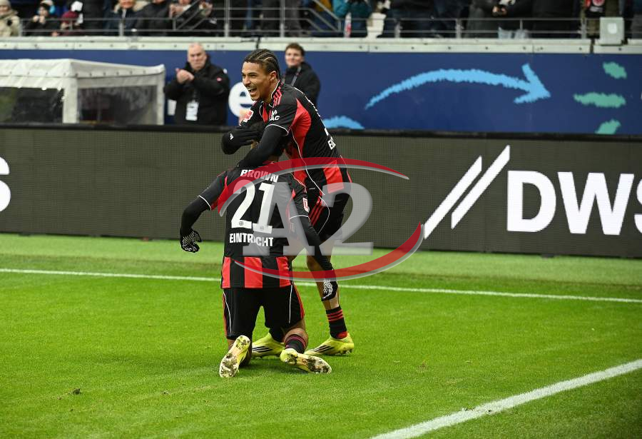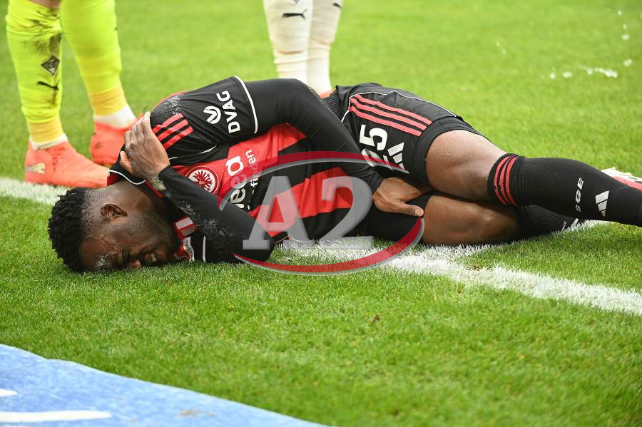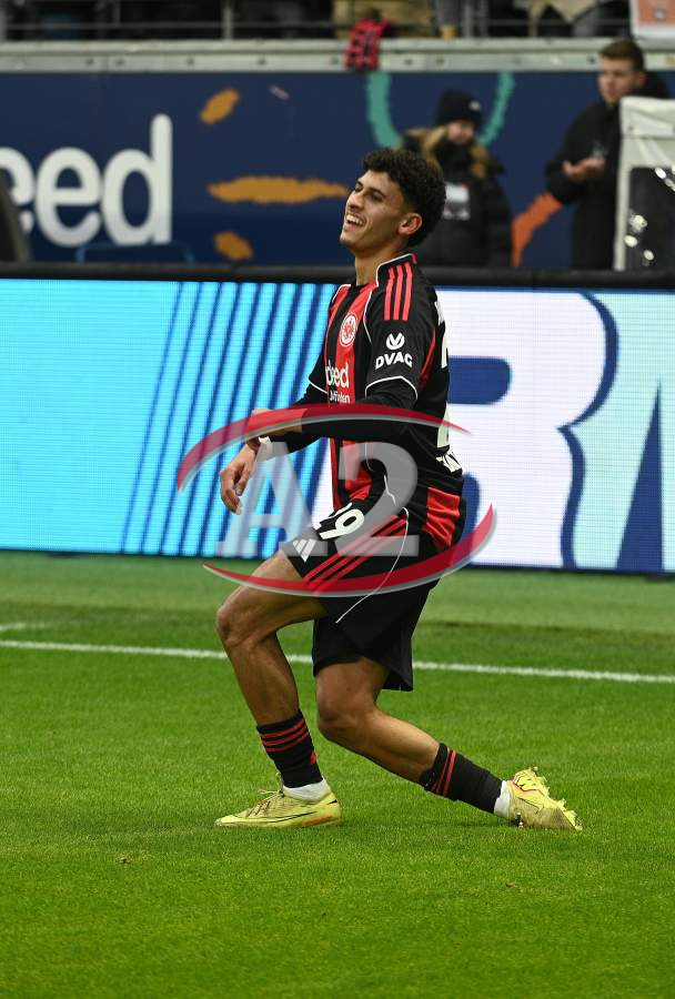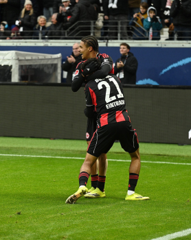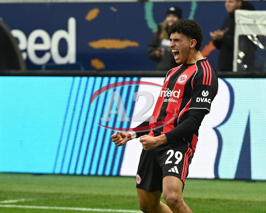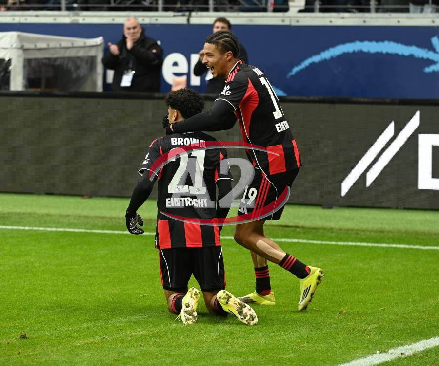 Torjubel nach dem Tor zum 2:0 durch Ayoube Amaimouni-Echghouyab (29, Eintracht Frankfurt) feiert auch nochmal Nathaniel Brown (21, Eintracht Frankfurt)