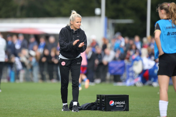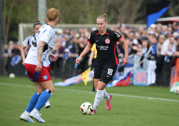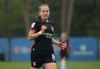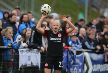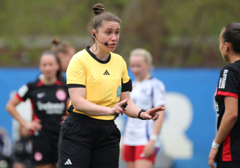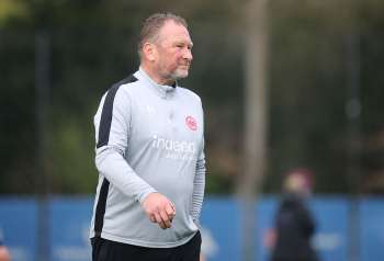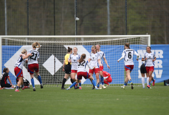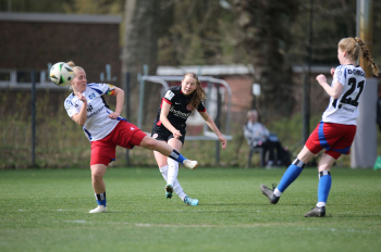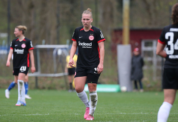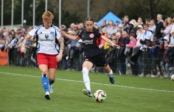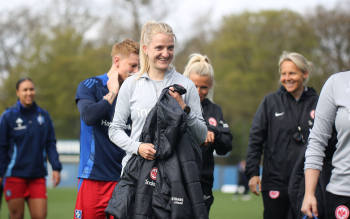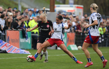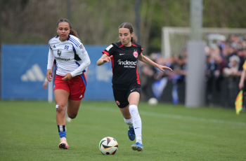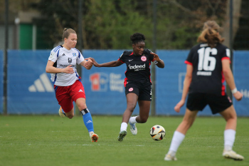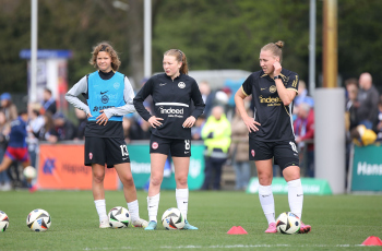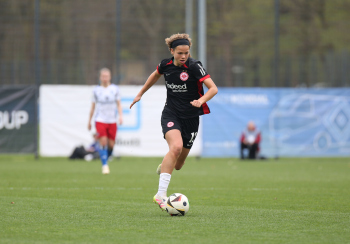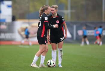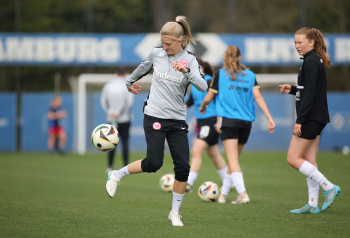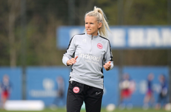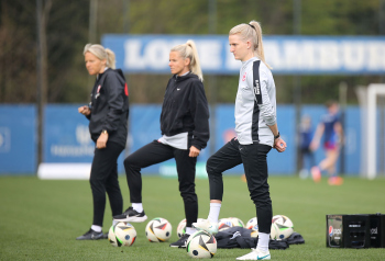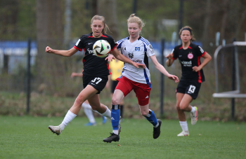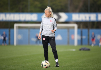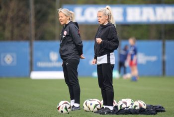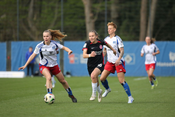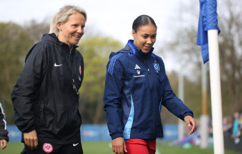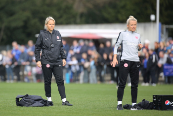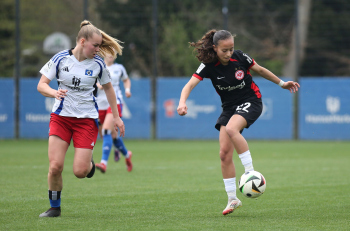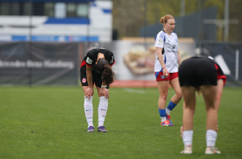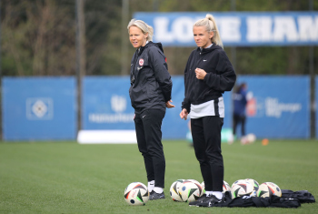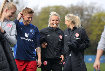 13.04.2025, xcex, GER, Hamburg, Volksparkstadion Platz 6, Frauenfussball, 2. Frauen-Bundesliga, Saison 2024/2025, Spieltag 21, HSV Frauen - Eintracht Frankfurt II (SGE), Jobina Lahr (HSV), Julia Simic (Trainerin, SGE), Friederika Fritzy Kromp (Trainerin, SGE)