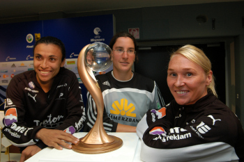 23.05.2008, 1. FFC Frankfurt vs Umea IK, Von links: Weltfu?ballerin Marta Vieira da Silva (Umea IK), Birgit Prinz (FFC), Frida ?stberg