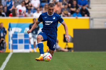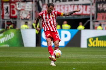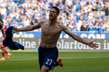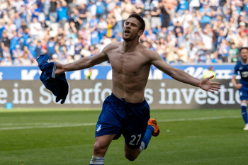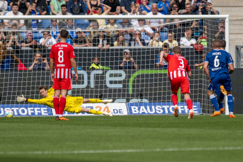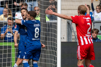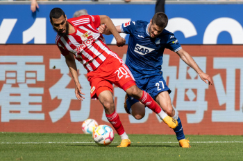 Torjubel des Torschützen Andrej Kramaric (TSG 1899 Hoffenheim), enttäuscht, Enttäuschung, Frust, frustriert, niedergeschlagen bei Jerome Roussillon (1.FC Union Berlin).