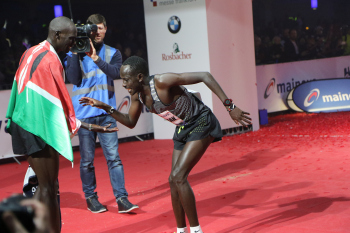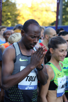 30.10.2016 Frankfurt am Main , Mainova Frankfurt Marathon 2016 Start Woldegeberel, Tadesse Tola (ETH) betet, daneben Stockhecke, Mona (GER) ***** Foto: Peter Hartenfelser