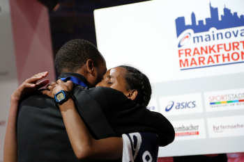 30.10.2016 Frankfurt am Main , Mainova Frankfurt Marathon 2016 Im Ziel hat die Deutsche Meisterschaft 2016 gewonnen Tola, Fate (GER) und erh?lt die Gl?ckw?nsche von ihrem Ehemann Musa Roba-Kinkal ***** Foto: Peter Hartenfelser