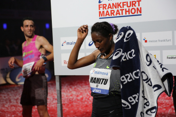 30.10.2016 Frankfurt am Main , Mainova Frankfurt Marathon 2016 Im Ziel hat die Deutsche Meisterschaft 2016 gewonnen Tola, Fate (GER) ***** Foto: Peter Hartenfelser