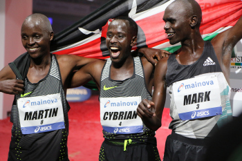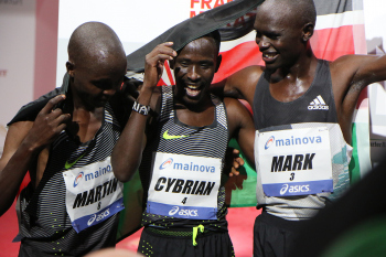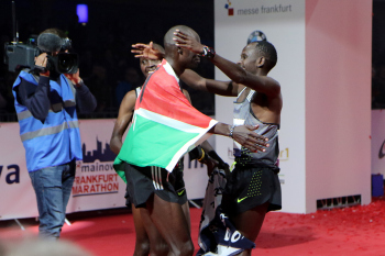 30.10.2016 Frankfurt am Main , Mainova Frankfurt Marathon 2016 Im Ziel Kosgey, Martin Kiprugut (KEN) Kotut, Cybrian Kimurgor (KEN) Sieger Korir, Mark (KEN) ***** Foto: Peter Hartenfelser