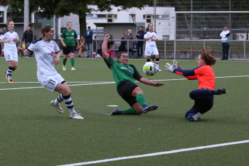 Katharina Droszcz (TSG Neu-Isenburg) gegen Kim-Nadine Riebeling und Torwart Anja Lepper (Hessen Wetzlar II)