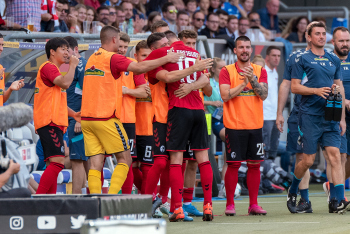 Jubel und Freude bei Philipp Lienhart (SC Freiburg), Lucas Höler (SC Freiburg), Robin Koch (SC Freiburg), Mike Frantz (SC Freiburg), Torschütze Christian Günter (SC Freiburg), Nils Petersen (SC Freiburg), Janik Haberer (SC Freiburg) und Nicolas Höfler (SC Freiburg).