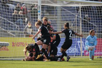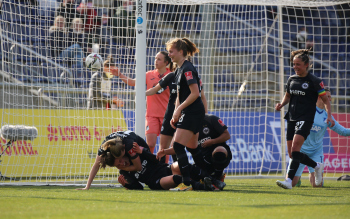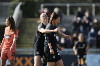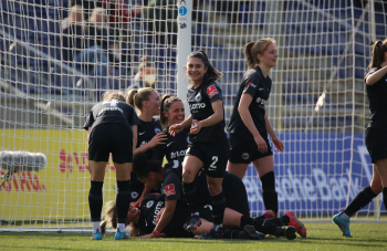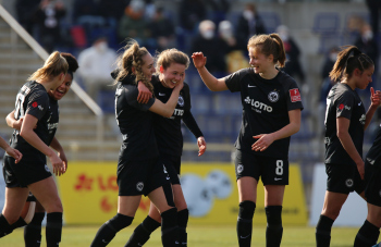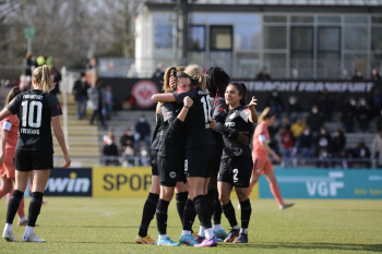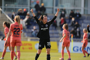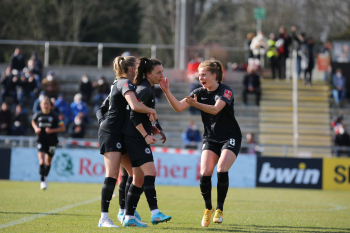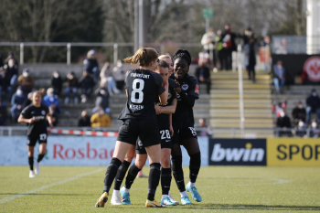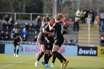 FLYERALARM Frauen-Bundesliga Saison 2021/2022, Spieltag 15, SGE, TSG, Eintracht Frankfurt Frauen - TSG 1899 Hoffenheim, Torjubel Eintracht Frankfurt Frauen, Jubel, Freude, Emotionen, Goal celebration, Anna Aehling (SGE) bejubelt ihren Siegtreffer, Sophia Kleinherne, Sjoeke Nuesken (SGE)