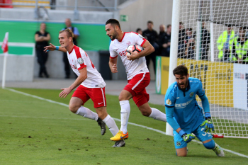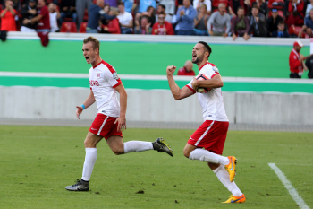 Torwart Samuel Sahin-Radlinger (Hannover) geschlagen, Torjubel bei Stefano Maier und Benjamin Kirchhoff (OFC)