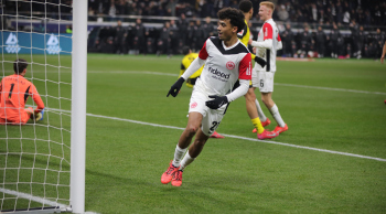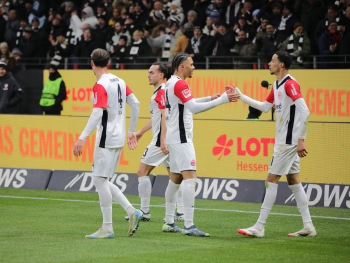 Torjubel nach dem Tor zum 1:0 durch Hugo Ekitike (11, Eintracht Frankfurt), hier mit Arthur Theate (3, Eintracht Frankfurt) und Robin Koch (4, Eintracht Frankfurt)