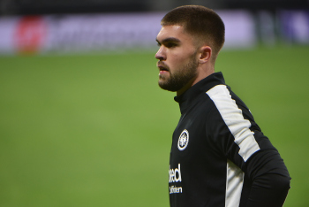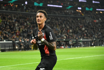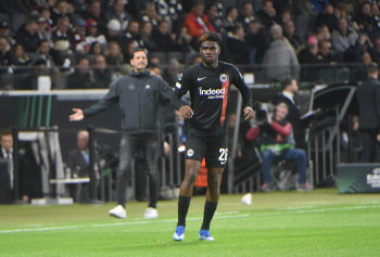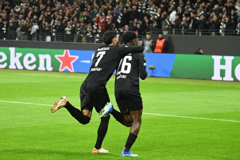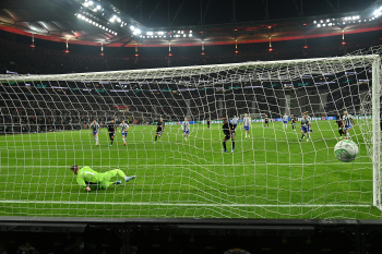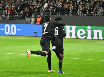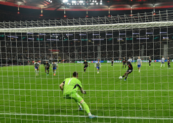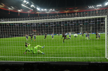 Junior Dina Ebimbe (26, Eintracht Frankfurt) verwandelt den Strafstoß / Elfmeter zum 1:0, Mario Götze (27, Eintracht Frankfurt) kommt zum gratulieren