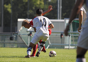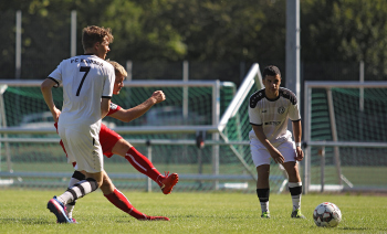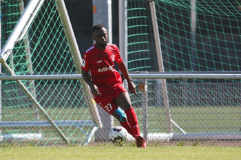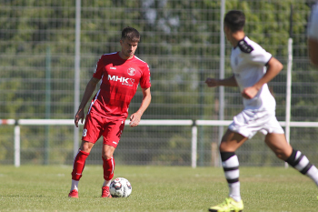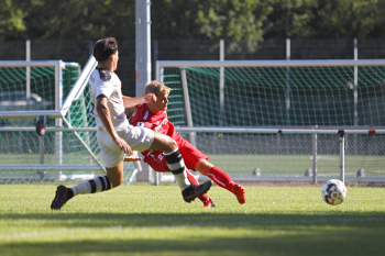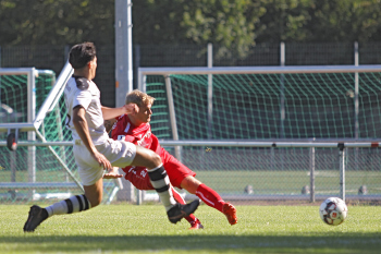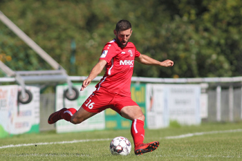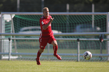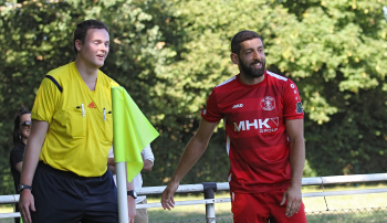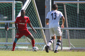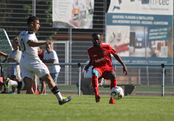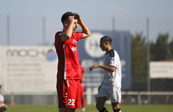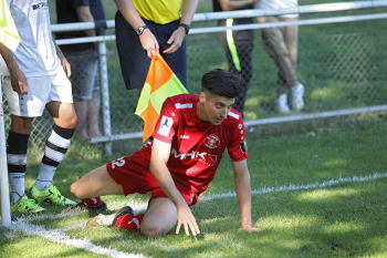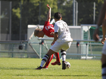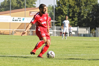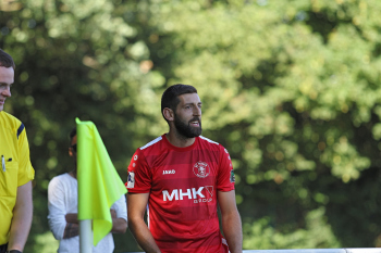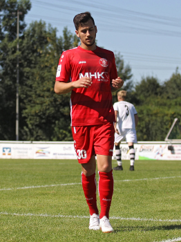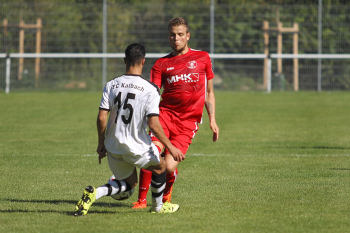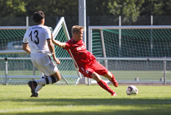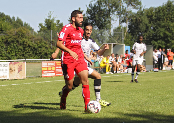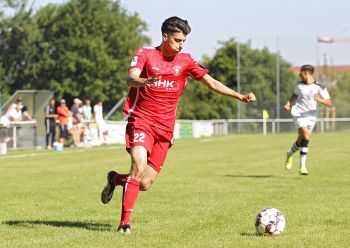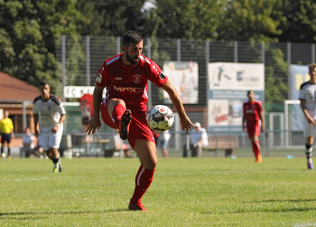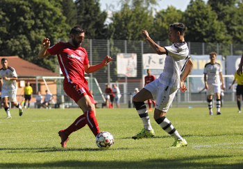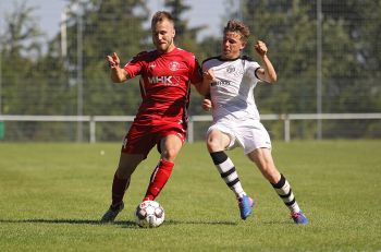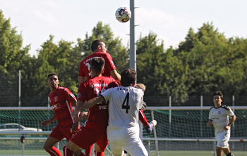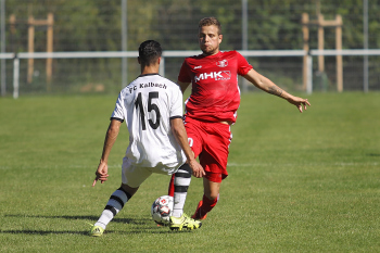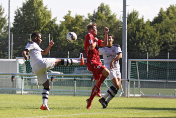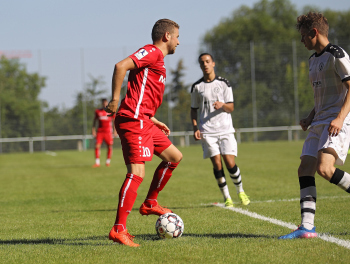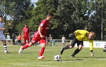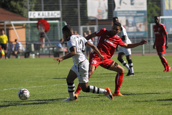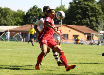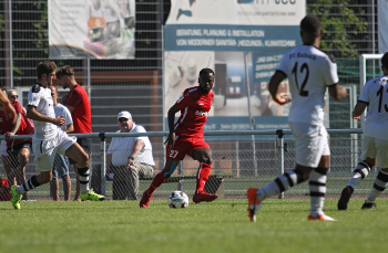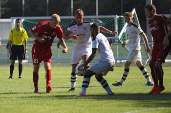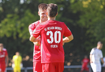 30.06.2018, xxx, Fussball, Regionalliga Suedwest 2018/2019, Testspiel FC Kalbach - SC Hessen Dreieich, vl.: Keanu Hagley (SC Hessen Dreieich), Torschuetze Julian Dudda (SC Hessen Dreieich), Denis Streker (SC Hessen Dreieich), Ljubisa Gavric (SC Hessen Dreieich),