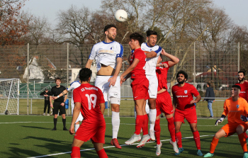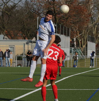 17.02.2019 xmgoodx Offenbach, Rosenhöhe Saison 2018/2019 Testspiel SG Rosenhöhe - Viktoria Urberach Guiseppe Serra (Rosenhöhe) gewinnt das Kopfballduell ****** Foto: Peter Hartenfelser