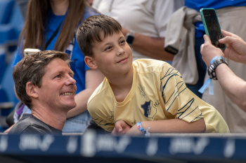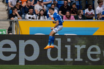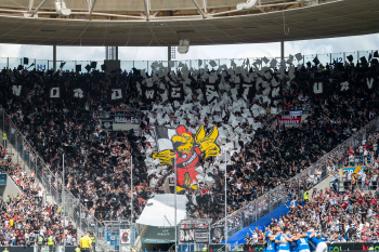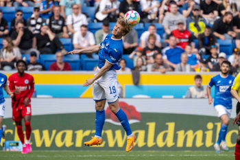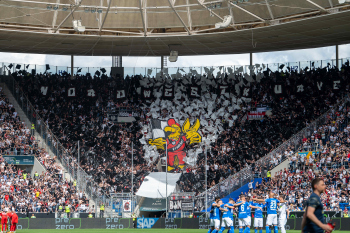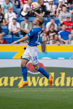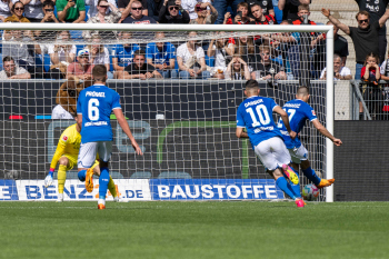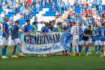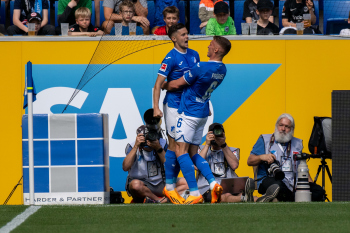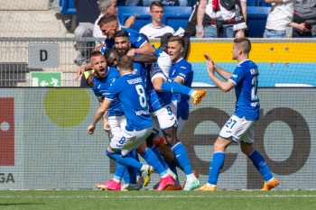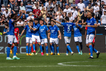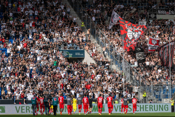 Die Hoffenheimer Spieler feiern mit Ihren Fans, v.l. Maskottchen HOFFI, John Anthony Brooks, Christoph Baumgartner, Ermin Bicakcic, Ozan Kabak, Sebastian Rudy, Finn Ole Becker, Umut Tohumcu, Munas Dabbur, Kasper Dolberg, Ihlas Bebou, Andrej Kramaric, Angelino, Grischa Prömel, Torwart Oliver Baumann und Dennis Geiger (TSG 1899 Hoffenheim).