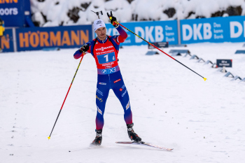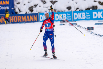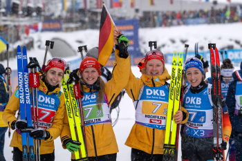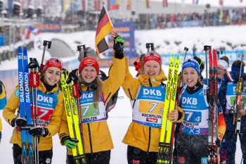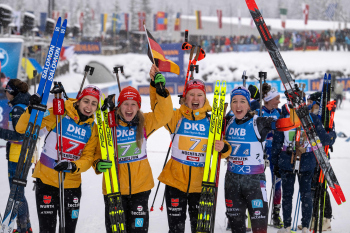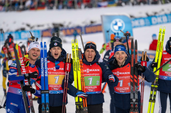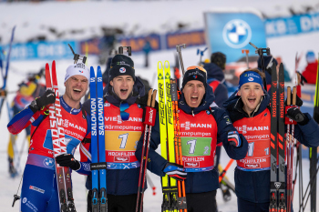 Jubel und Freude bei der Siegerstaffel, v.l. Emilien Jacquelin, Eric Perrot, Quentin Fillon Maillet und Fabien Claude (FRA).