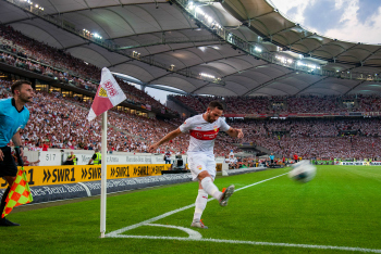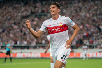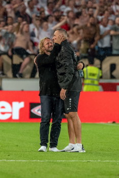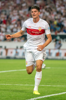 Die Stuttgarter Spieler Orel Mangala, Mario Gomez, Pascal Stenzel, Marc-Oliver Kempf, Torwart Fabian Bredlow, Borna Sosa, Holger Badstuber, Hamadi Al Ghaddioui, Philipp Klement, Torwart Gregor Kobel, Gonzalo Castro, Daniel Didavi, Maskottchen Fritzle, Santiago Ascacibar feiern mit Ihren Fans.