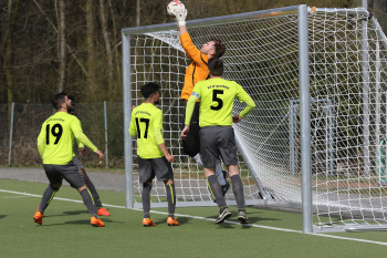 02.04.2018 Offenbach KOL, Kreisoberliga Offenbach Saison 2017/2018 BSC 99 Offenbach gegen DJK Sparta Bürgel Torwart Ralh Henne (BSC 99 Offenbach) rettet hier vor drei Gegenspielern *** Foto: A2/Hartenfelser