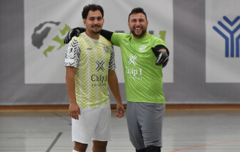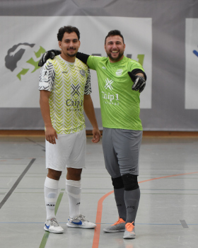 15.10.2023 Dreieich Futsal-Bundesliga 2023/24. SV Pars Neu-Isenburg gegen Fortuna Düsseldorf Anis Nassif (19, SV Pars Neu-Isenburg) und Torwart Hellal Hosaine (1, SV Pars Neu-Isenburg) ***** Foto: A2Bildagentur Hartenfelser