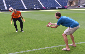 17.08.2022 Frankfurt am Main, Deutsche Bank Park Benefizspiel Champions for Charity PK Rollentausch gibt den Torwart Dirk Nowitzki emspor, ********* Foto: Peter Hartenfelser